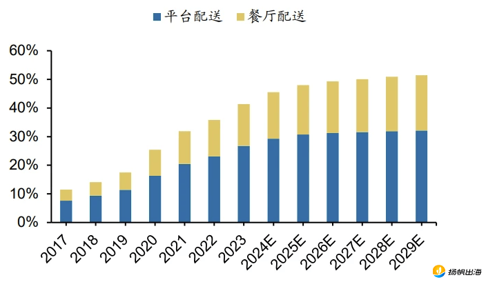 餐饮线上化历程不竭加速,据Statista数据显示,2023年海湾六国外卖GMV达101亿美元,估计2023至2029年复合年增加率为5。5%。